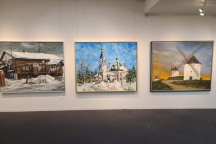 左から石川孝司「駅」油彩F100、私の作品(仲浩克)「冬の教会」油彩F100、中山一博「ラ・マンチャの風車」油彩F100。このあたりは大きな作品で見ごたえあるものです。