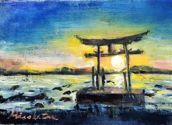 夕日映る鳥居の海 In 2023, 風景画 Tags夕方水辺 北海道の道北の日本海側の人口1000人程度のまちの初山別村の金毘羅神社の鳥居に夕日が沈む様子を描いています。 水辺の幻影、十勝岳と丘 教会からの眺望